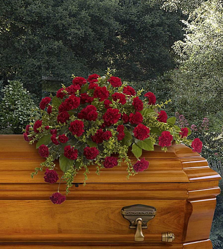 Honor a beautiful life with a timeless statement of love and respect. This classic half-couch casket spray is designed with radiant red carnations and mini carnations, layered over fresh, textural greenery for graceful depth. The rich red palette conveys devotion and remembrance, making it a dignified choice for traditional services and viewings.
