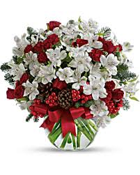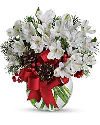 Pretty red spray roses accent white alstroemeria, berries, pinecones and Douglas fir accents in a clear glass bowl. Tied with a bright red satin ribbon, it's truly charming.