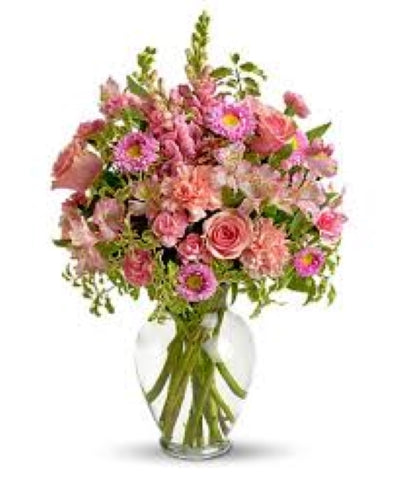 The lovely all-pink bouquet includes snapdragons, roses, carnations, alstroemeria, miniature carnations and matsumoto asters accented with assorted greenery.
